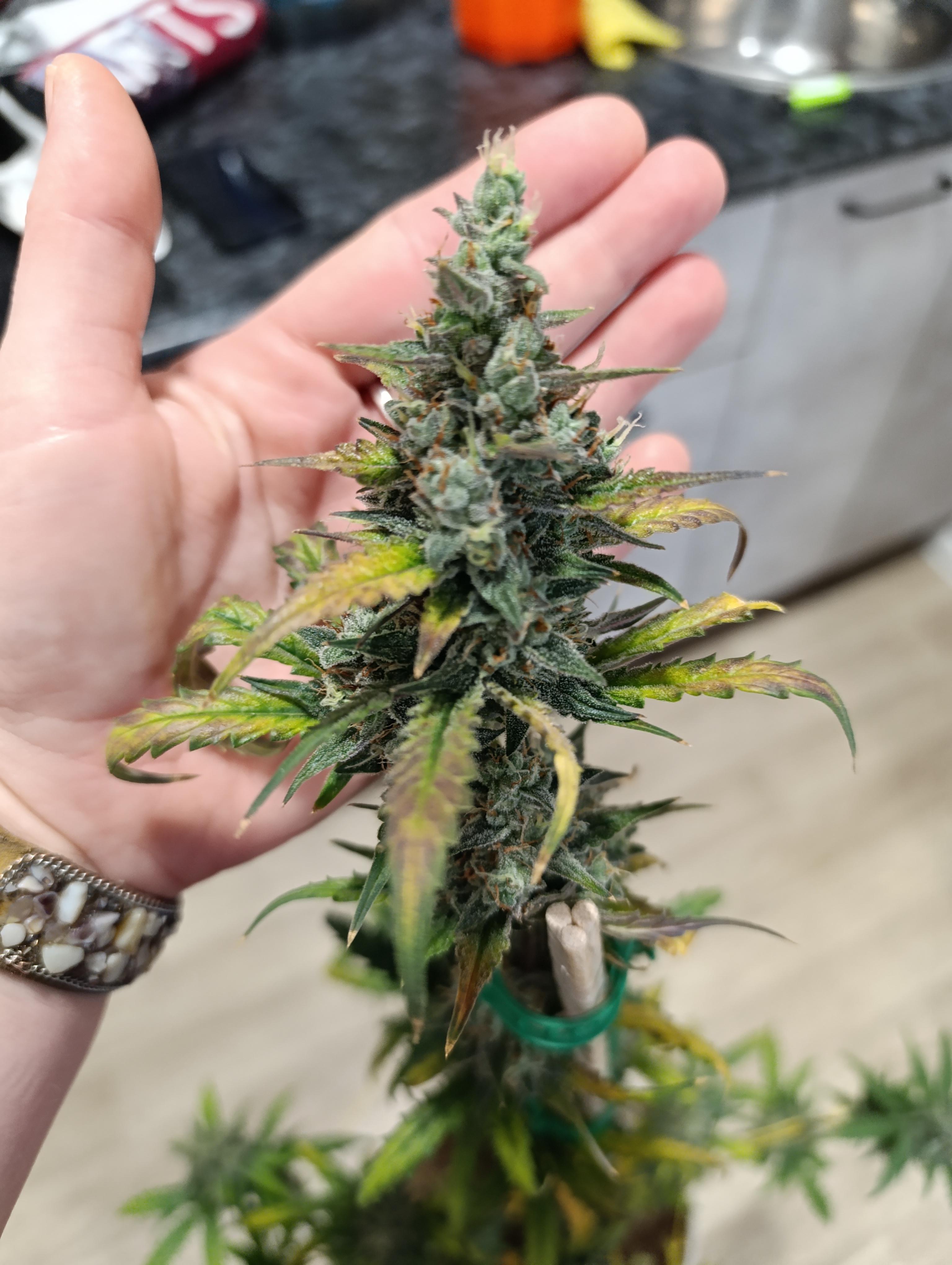 Вкус и запах отличный! Проблем в процессе не возникало. Росли в боксе, освещение на 2 растения 500 ватт , лампы led. Удобрения использовались профессиональные для каждой стадии, объем горшка 11 л, грунт торфяной с перлитом. Выход 150 до сушки, а после 40. Хотелось бы испробовать систему lst